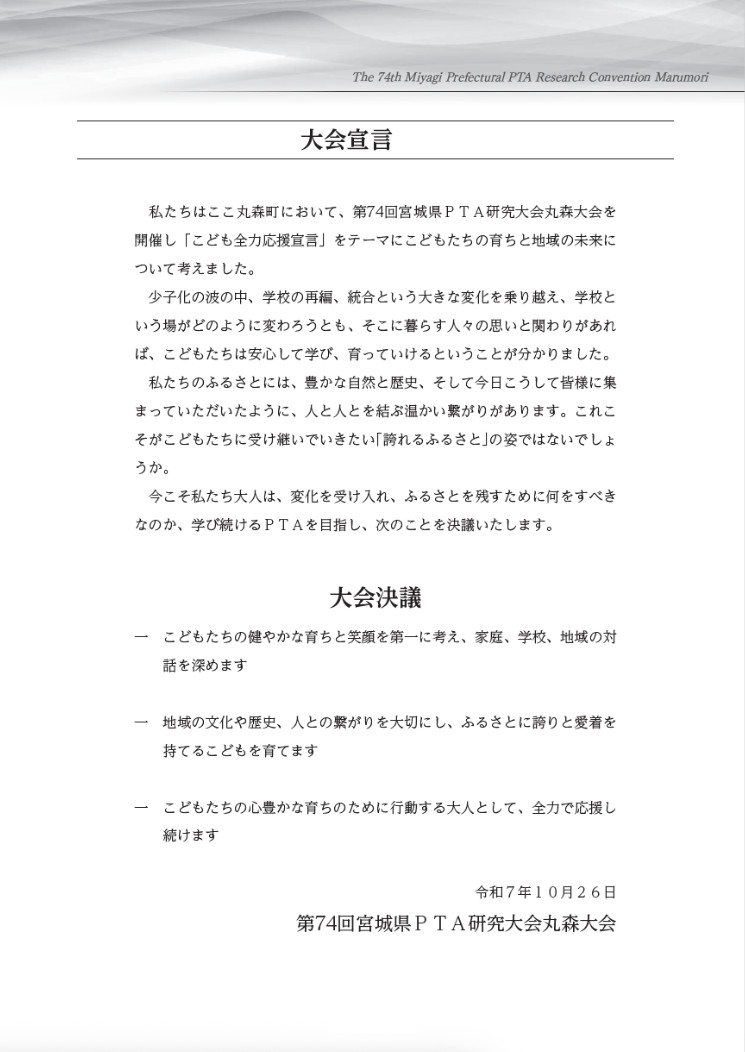 第74回宮城県PTA研究大会丸森大会 大会要項 2025年10月18日 最終更新日時 : 2025年10月26日 m02 「第74回宮城県PTA研究大会丸森大会」(令和7年10月26日(日)開催)の大会要項(抜粋)を掲載します。 ※10月26日(日)大会宣言・大会決議を追加しました。