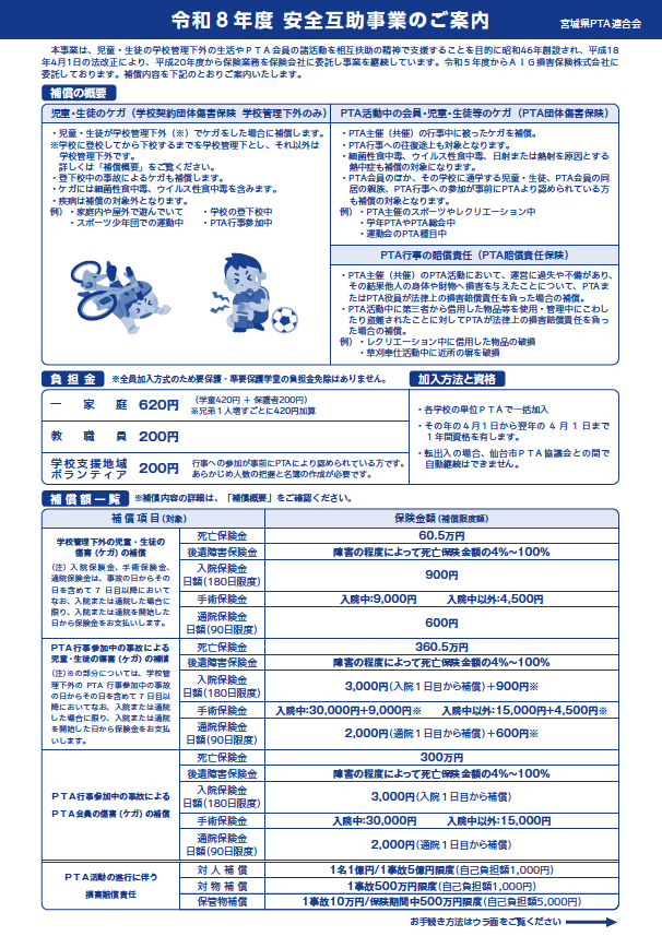 本事業は、学童の学校管理下外の生活やPTA会員の諸活動を相互扶助の精神で支援することを目的に昭和46年創設されました。